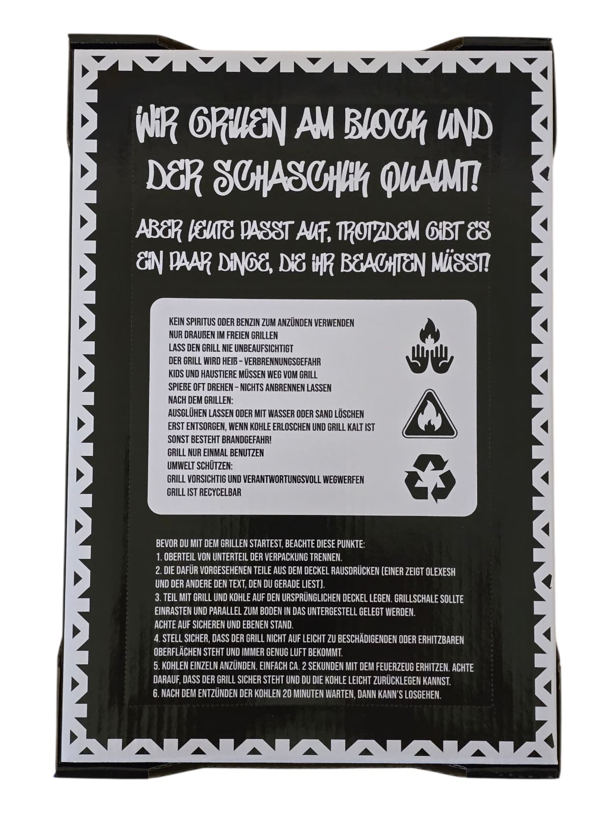 Kompakter Einweggrill im Co-Branding mySchaschlik × Olexesh. Fertig bestückt mit Grillkohle. Ideal für Park, Strand und Camping. Stabil, schnell einsatzbereit und für eine spontane Grillrunde ausgelegt.
